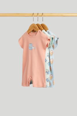 a three-pack of cotton all-in-one outfits. with fun prints, they make cool and comfy daytime outfits and with no waistband to irritate baby's tummy, they're the ideal alternative to pyjamas on warmer nights.